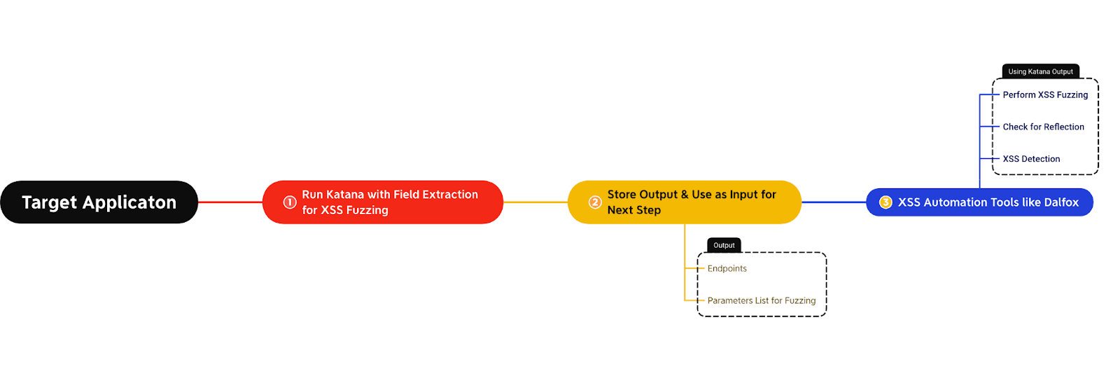For example, let’s assume you want to perform automated fuzzing for Cross-Site Scripting (XSS) vulnerabilities. In this case, you can attempt to extract the various unique parameters from the output and fuzz the uniquely identified endpoints with these parameters containing XSS payloads to check for potential reflection. The below flow diagram explains this use case:
