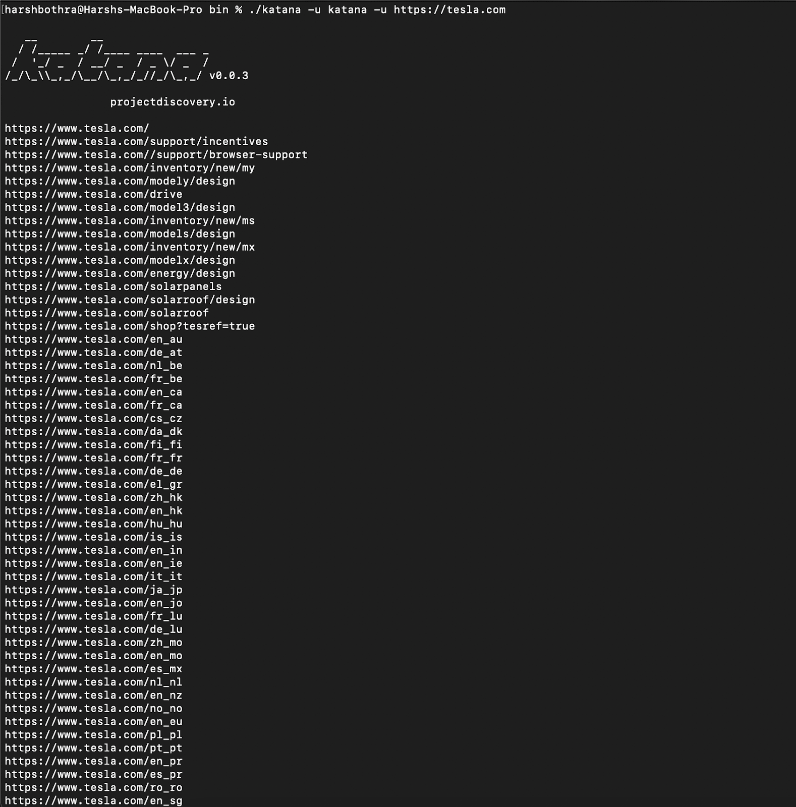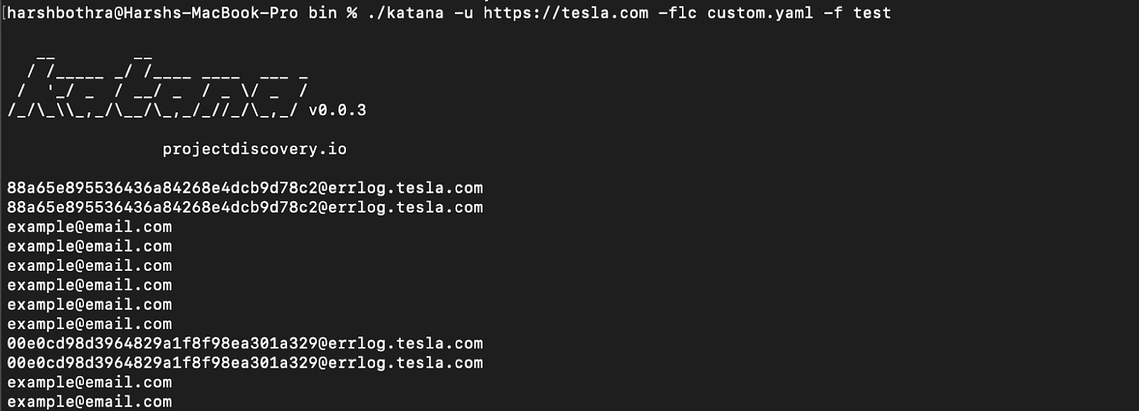 Command: katana -u https://tesla.com -flc custom.yaml -f test