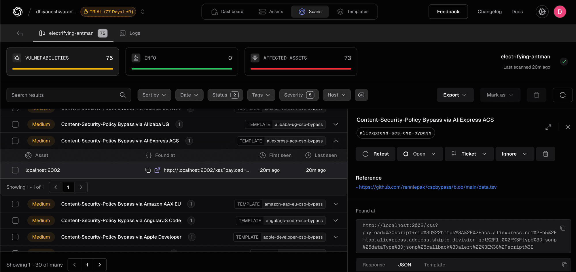 1docker-compose up -dIn this example, we'll create a DAST template to detect Content Security Policy (CSP) bypass vulnerabilities via AliExpress ACS domains.We'll begin by identifying the CSP header that allows AliExpress ACS domains and then check for potential bypass conditions in the script-src directive.