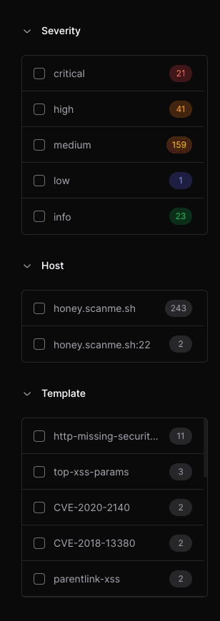 You can then filter the results using the column on the left side to find vulnerabilities by severity, host, or the specific template used: