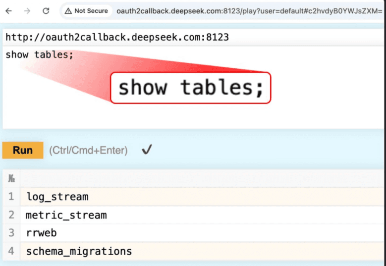 In DeepSeek’s case, their internal ClickHouse instance was left exposed to the internet with no authentication, no access controls, and no login requirements. This misconfiguration meant that anyone could access the database simply by navigating to the /play endpoint on publicly accessible instances. From there, a malicious actor could execute SQL queries and retrieve sensitive data in plain text with ease.
