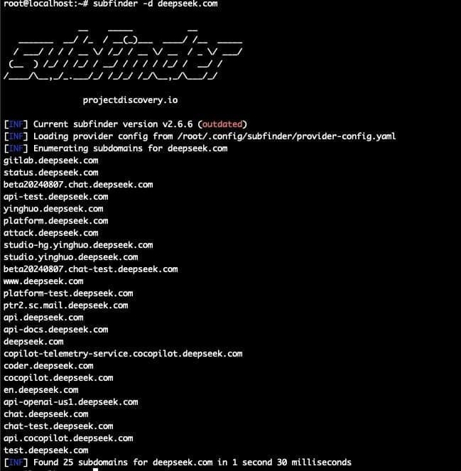 Effective reconnaissance always starts with identifying a company’s external attack surface. Here, researchers enumerated known subdomains belonging to DeepSeek by running subfinder, which queries multiple public DNS sources across the internet.