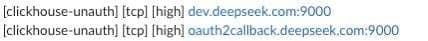 In this instance, researchers matched with a clickhouse-unauth template against hosts dev.deepseek.com:9000 and oauth2callback.deepseek.com:9000, suggesting that there were unauthorized ClickHouse instances exposed on these hosts.