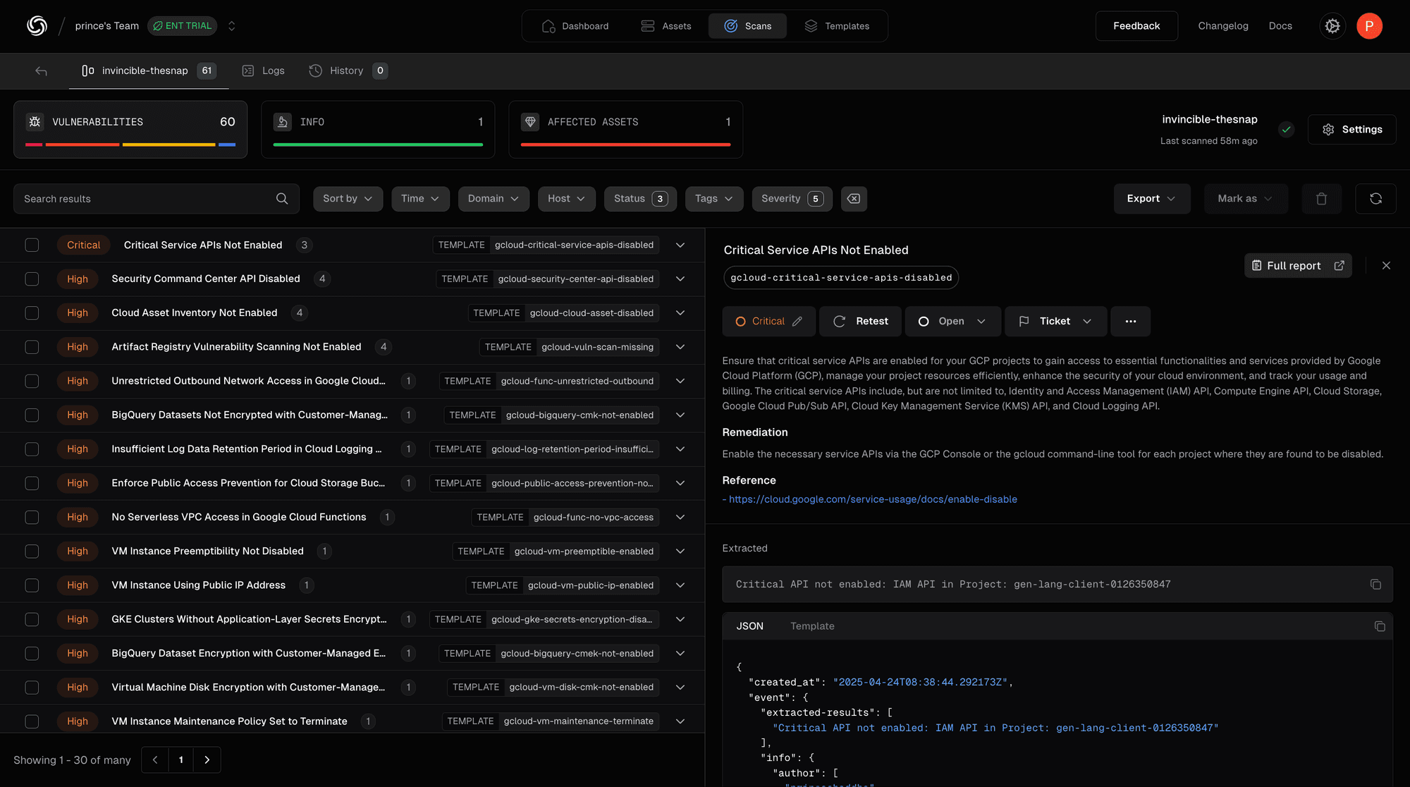 - Advanced Network Security Testing: Detailed checks on firewall rules, VPC restrictions, or ensuring appropriate usage of Private Service Connect can be performed with custom templates to validate an organization's specific network security posture.