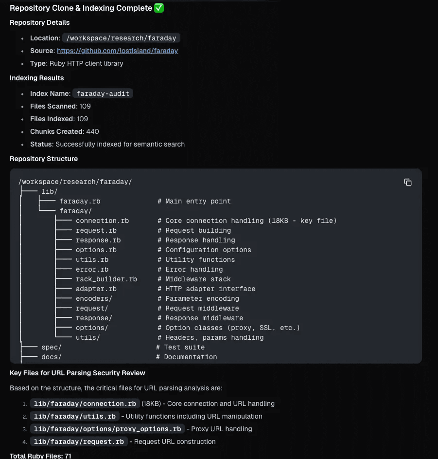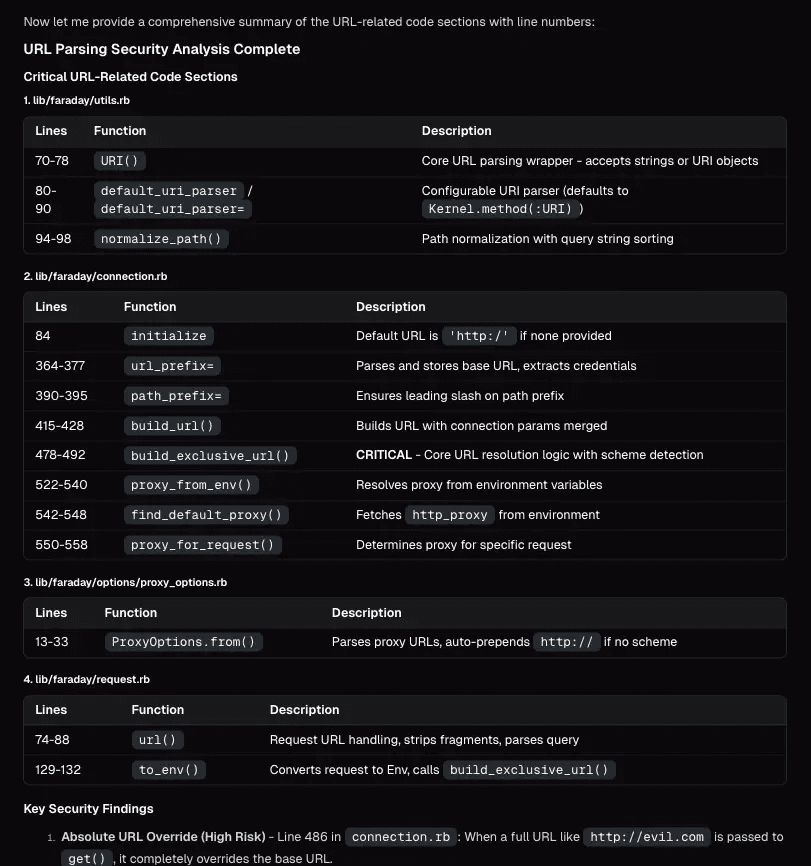 Instead, Neo mapped the full codebase and then narrowed its attention to the handful of files that control URL building and request routing. In Faraday, that meant starting with connection.rb and the URL and request helpers, because that is where a trusted base URL and a caller-provided path turn into a real outbound request.