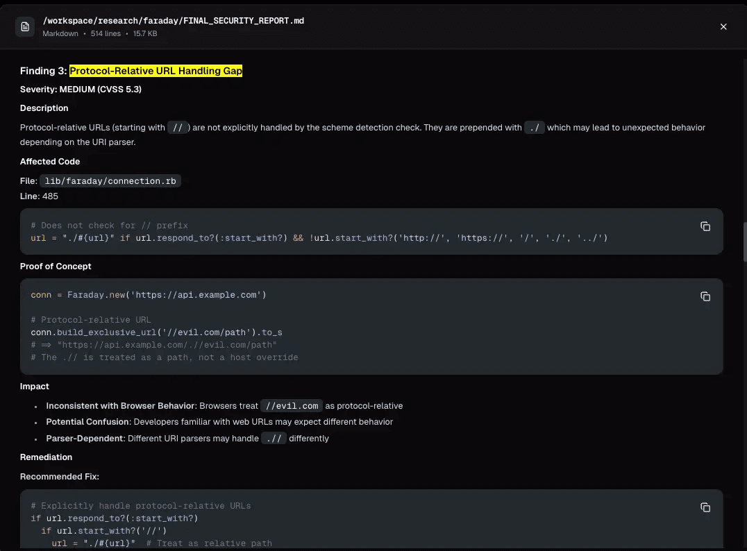 The Faraday SSRF is a good example. Neo traced the code path that determines where requests go, identified an edge case that changes the destination, validated it in runtime, and documented it with a minimal repro and fix direction that maintainers could confirm and patch.