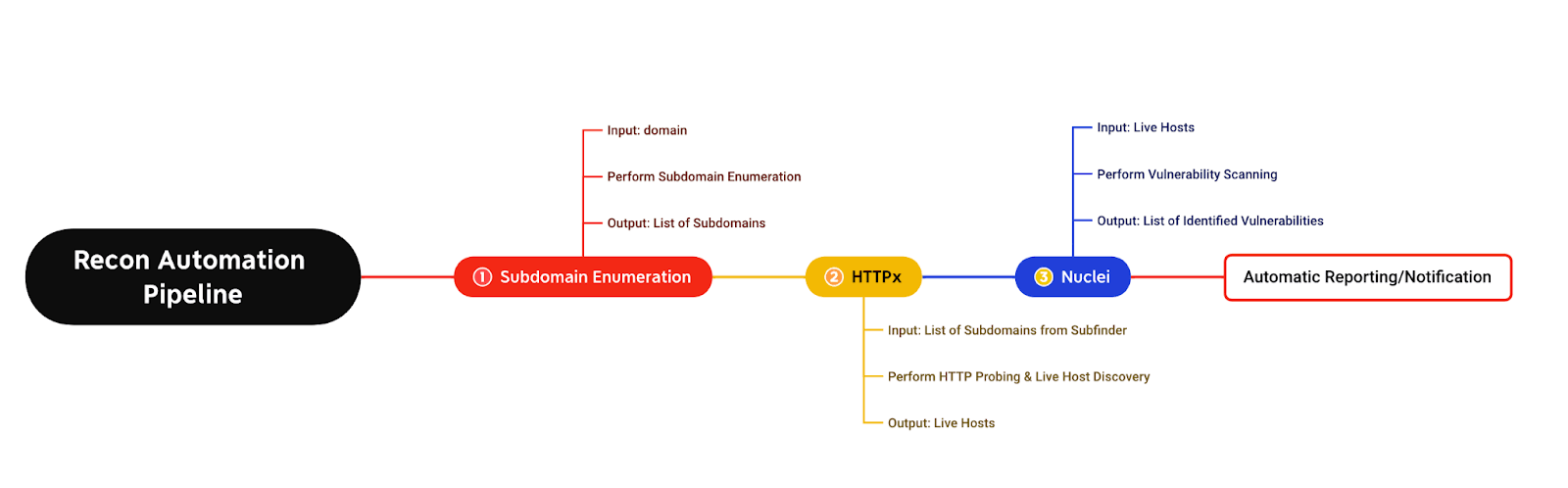 The beauty of ProjectDiscovery tools lies in their ability to integrate seamlessly and function as modules in an automation pipeline. This is exemplified in the mind map above, where a subdomain enumeration is performed on user-supplied input, returning a comprehensive list of subdomains. This list is then fed into HTTPX, which performs HTTP probing to identify live hosts. The resulting live hosts can be further fed into Nuclei for vulnerability scanning, with the identified vulnerabilities automatically reported or notified using the Notify tool.