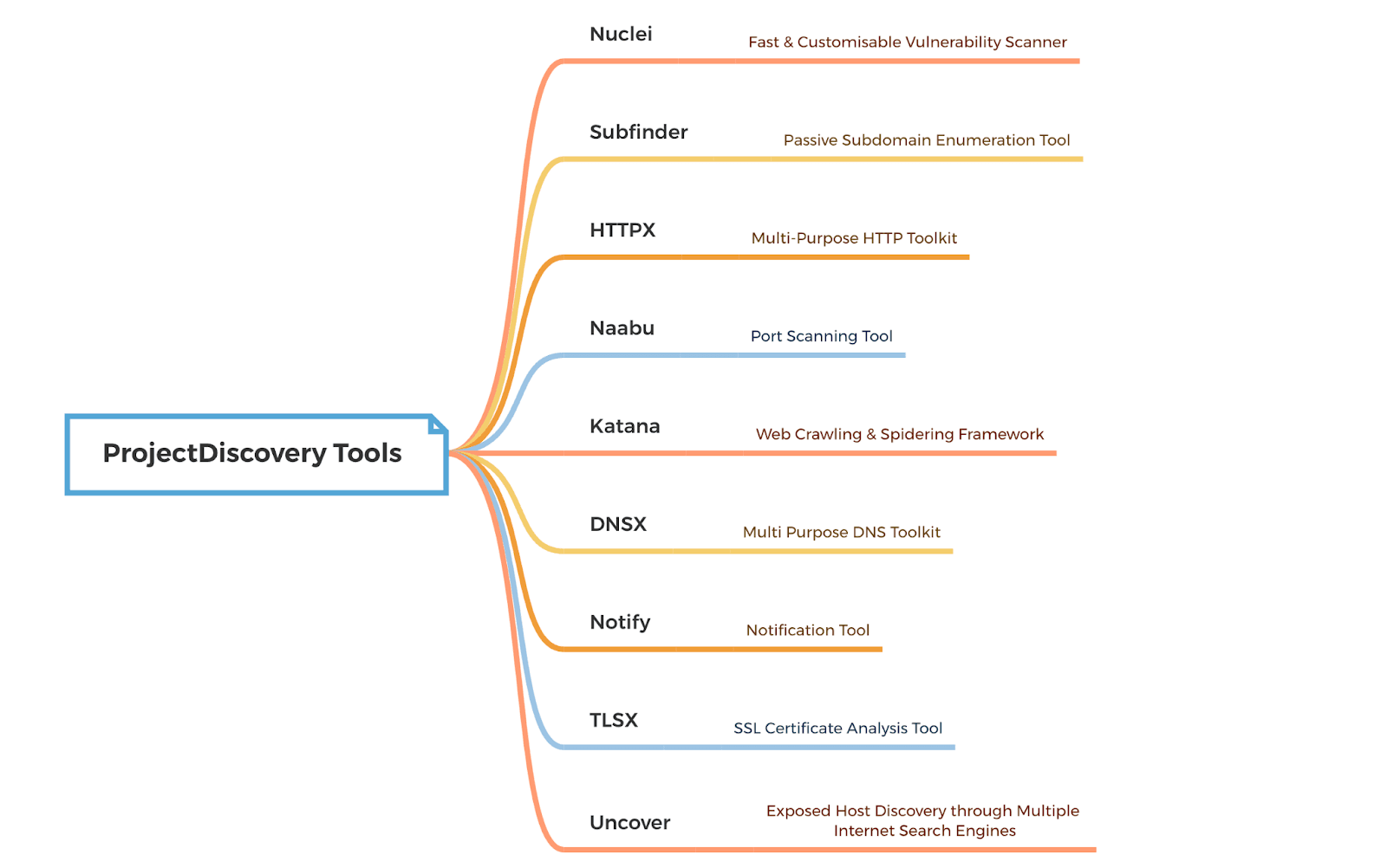 The mind map showcases several widely used ProjectDiscovery tools, each of which embodies the Unix Philosophy's simplicity principle by being specifically designed to perform a single task with maximum efficiency.