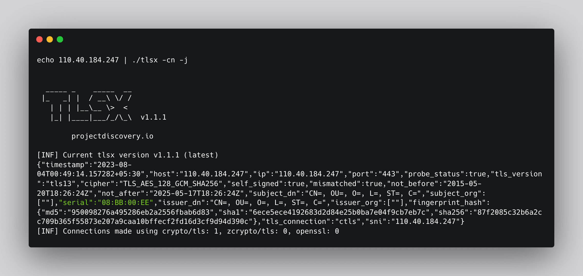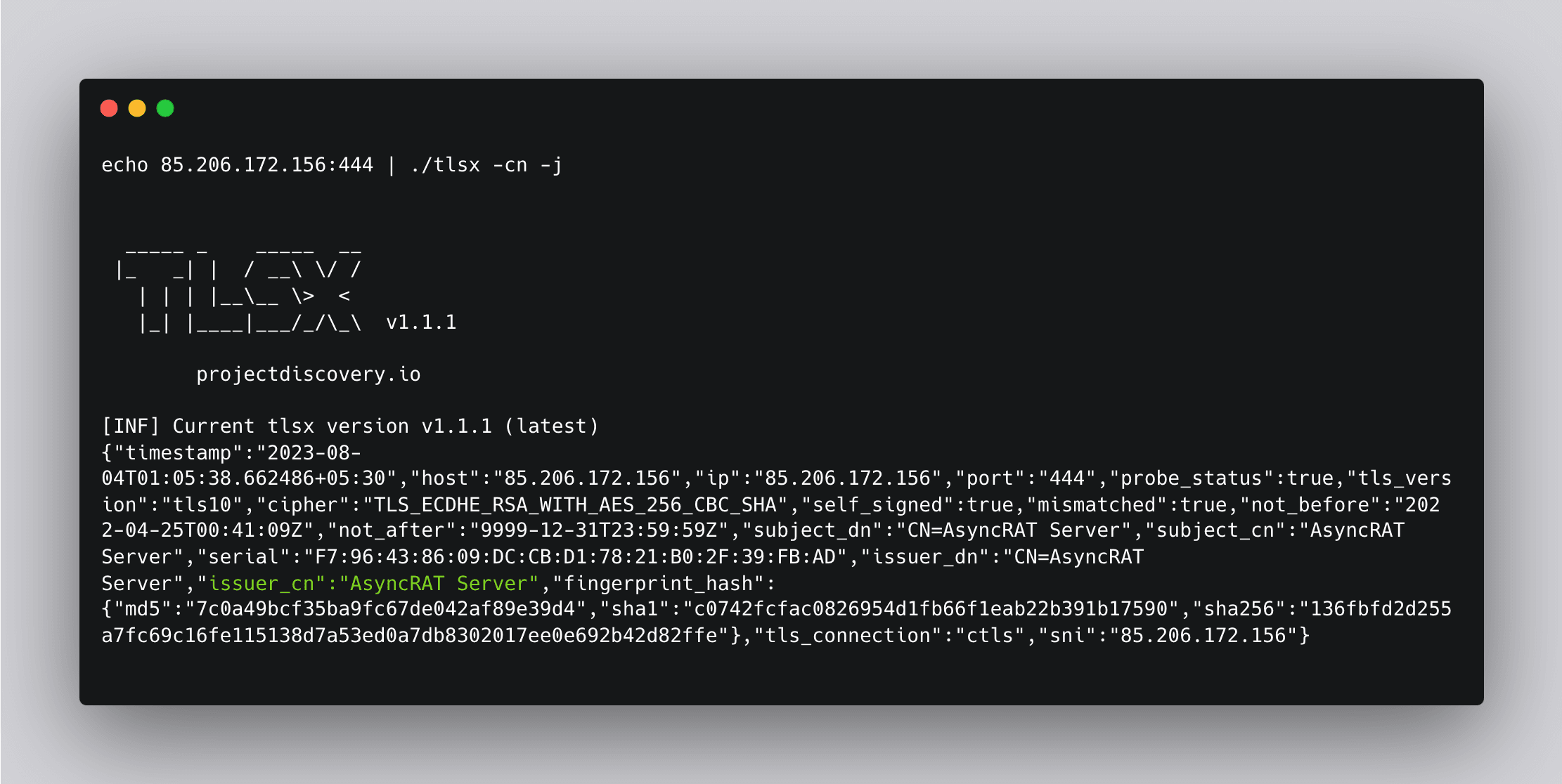 Command: echo 85.206.172.156:444 | ./tlsx -cn -j
