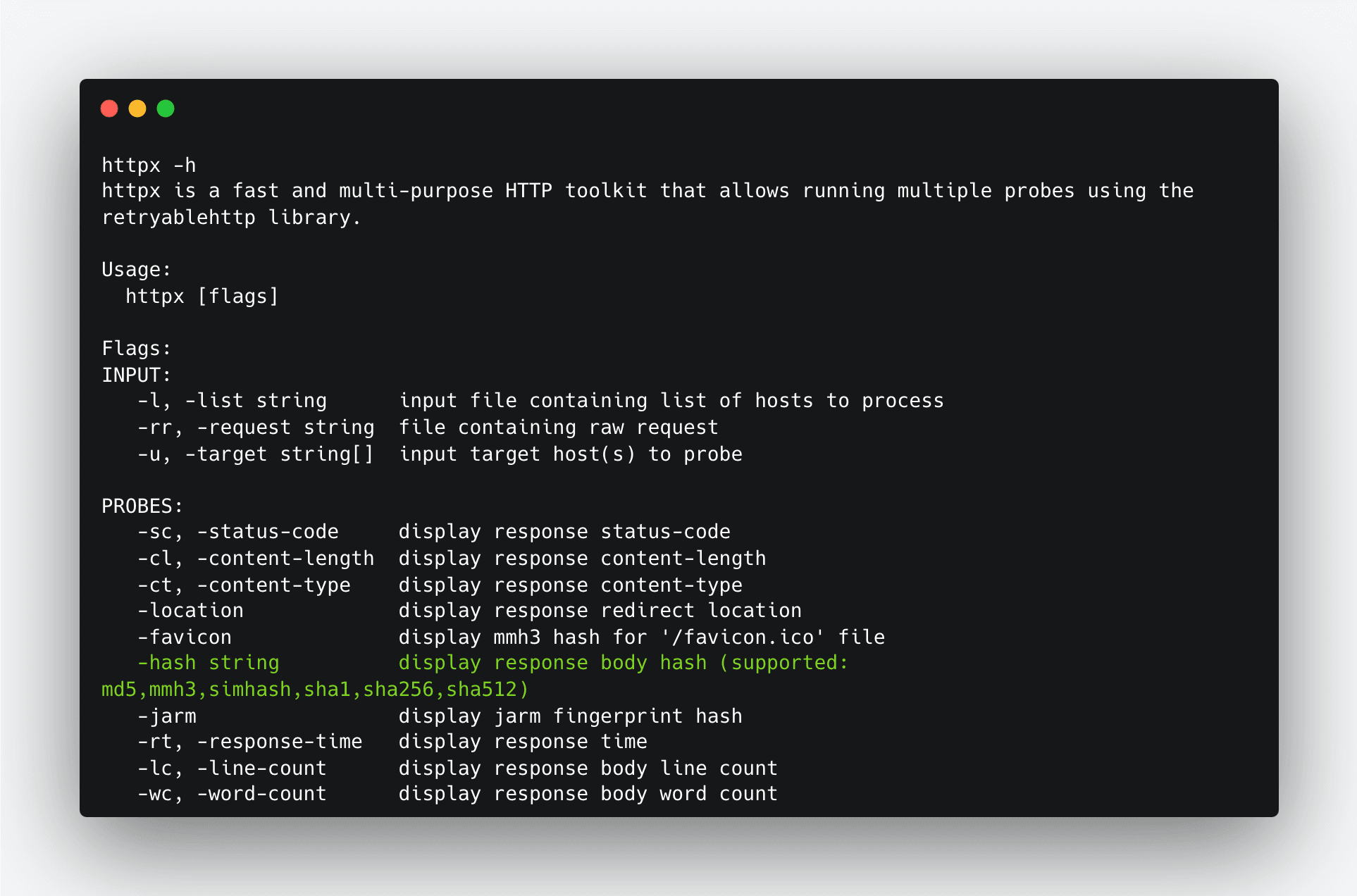 Hashing the response body involves calculating a cryptographic hash value from the content of the server's response before it is sent back to the client. By comparing these hashed response bodies, we can detect potential C2 servers. We can use httpx to generate a response body hashed with different algorithms.