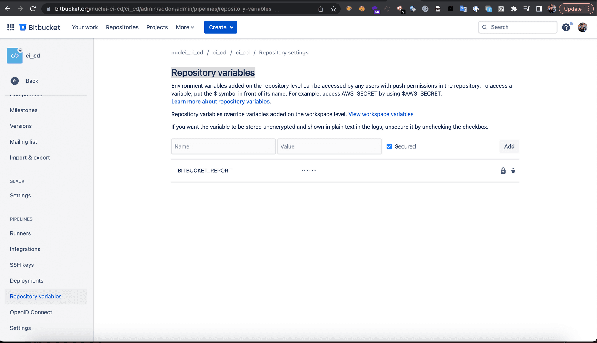 - Navigate to your Repository > Repository settings and under pipelines section, select “Repository variables”