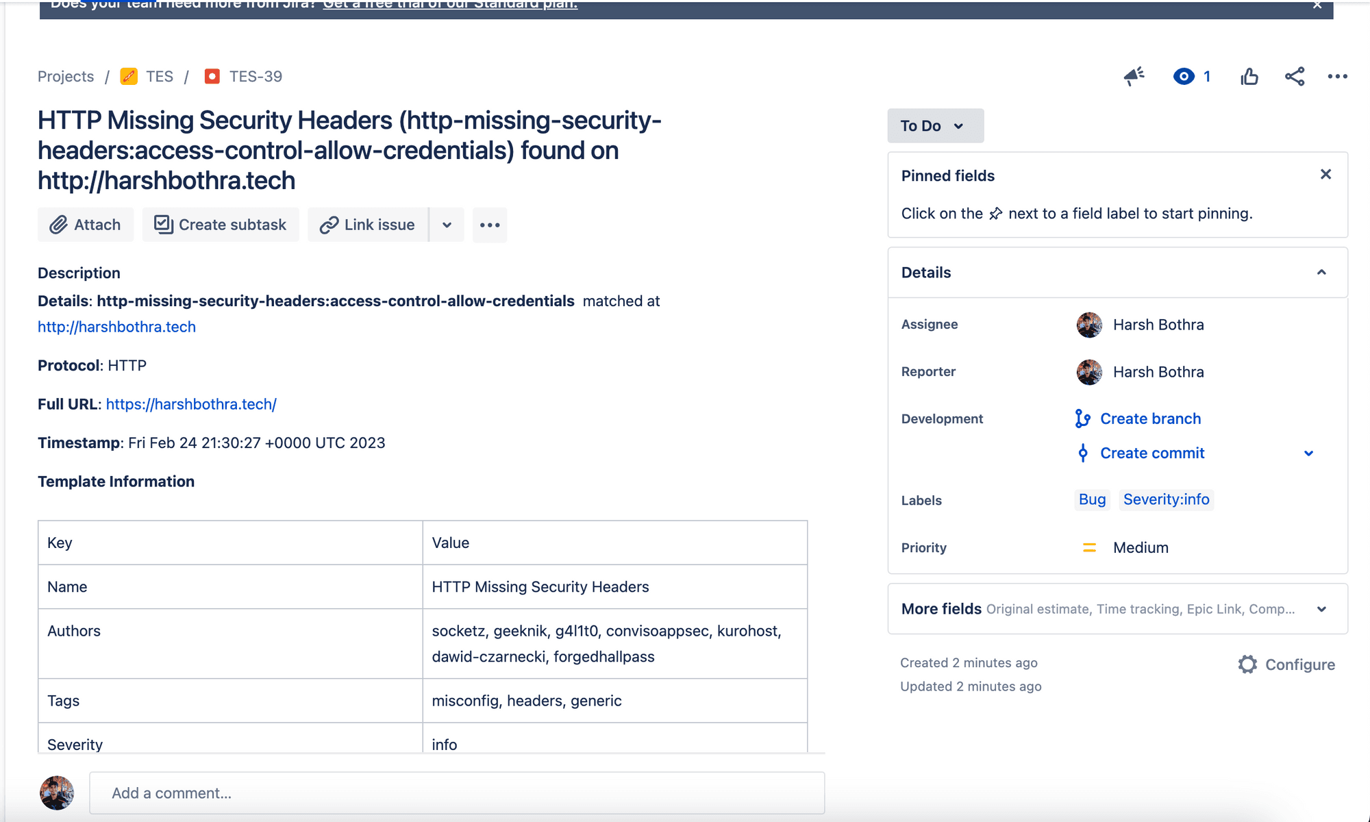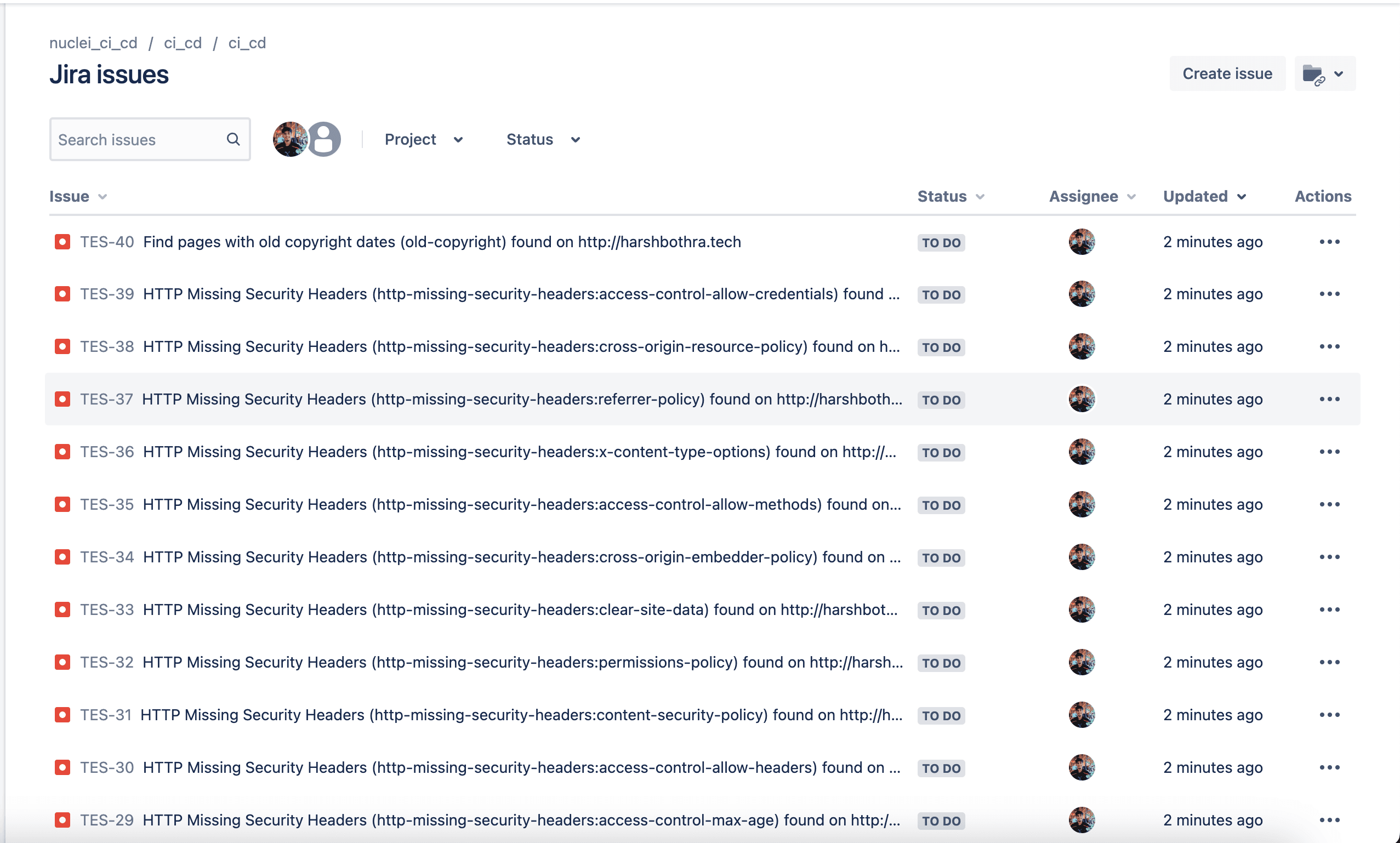 13 - nuclei -u http://harshbothra.tech -rc report.yamlExplanation of the code: In the above code, the script will read the CI/CD variable and re-create the report.yaml file which will further be fed to nuclei using -rc (report config) parameter. The rest script is similar to what we previously used but now it is more powerful as it will perform automatic issue creation on Jira.