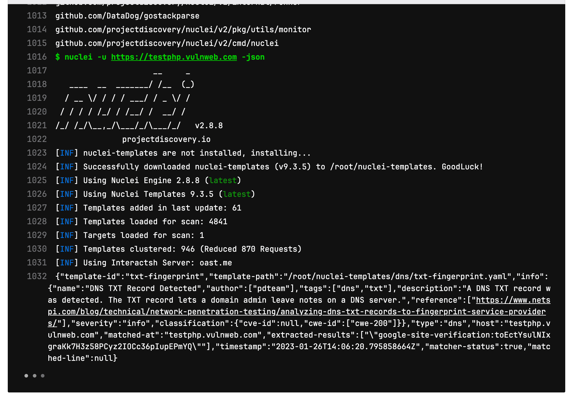 8 - nuclei -u https://testphp.vulnweb.com -json