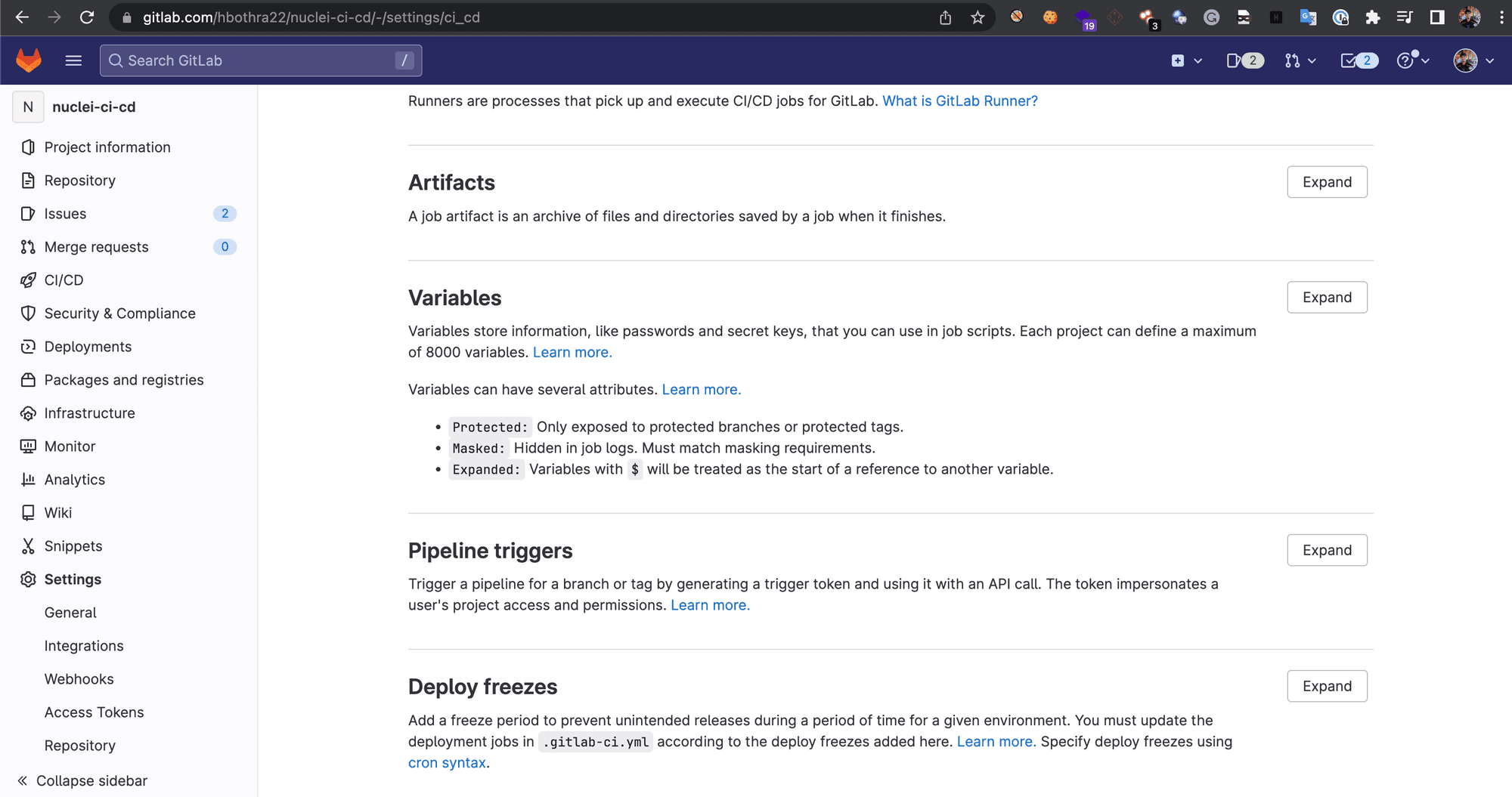 - Navigate to your Project > Settings > CI/CD and in the Variables section, click on “Expand”.