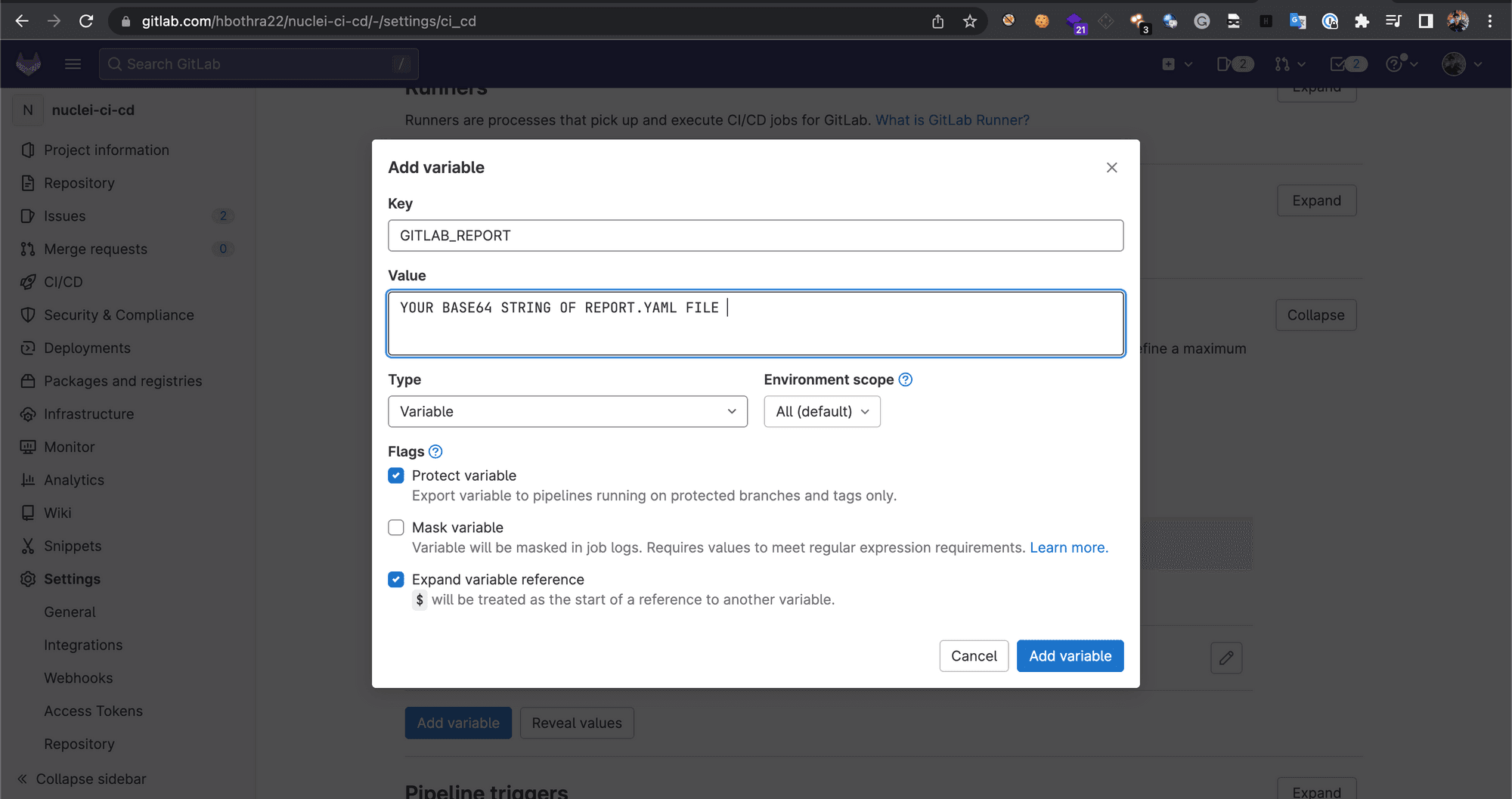 2. Click on “Add Variable”. In the Key field add “GITLAB_REPORT” (without quotes) and in the Value field add the base64 string of the report.yaml file.