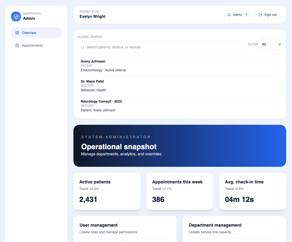 Admins can: manage all users, view system-wide analytics, manage departments, and override appointments.