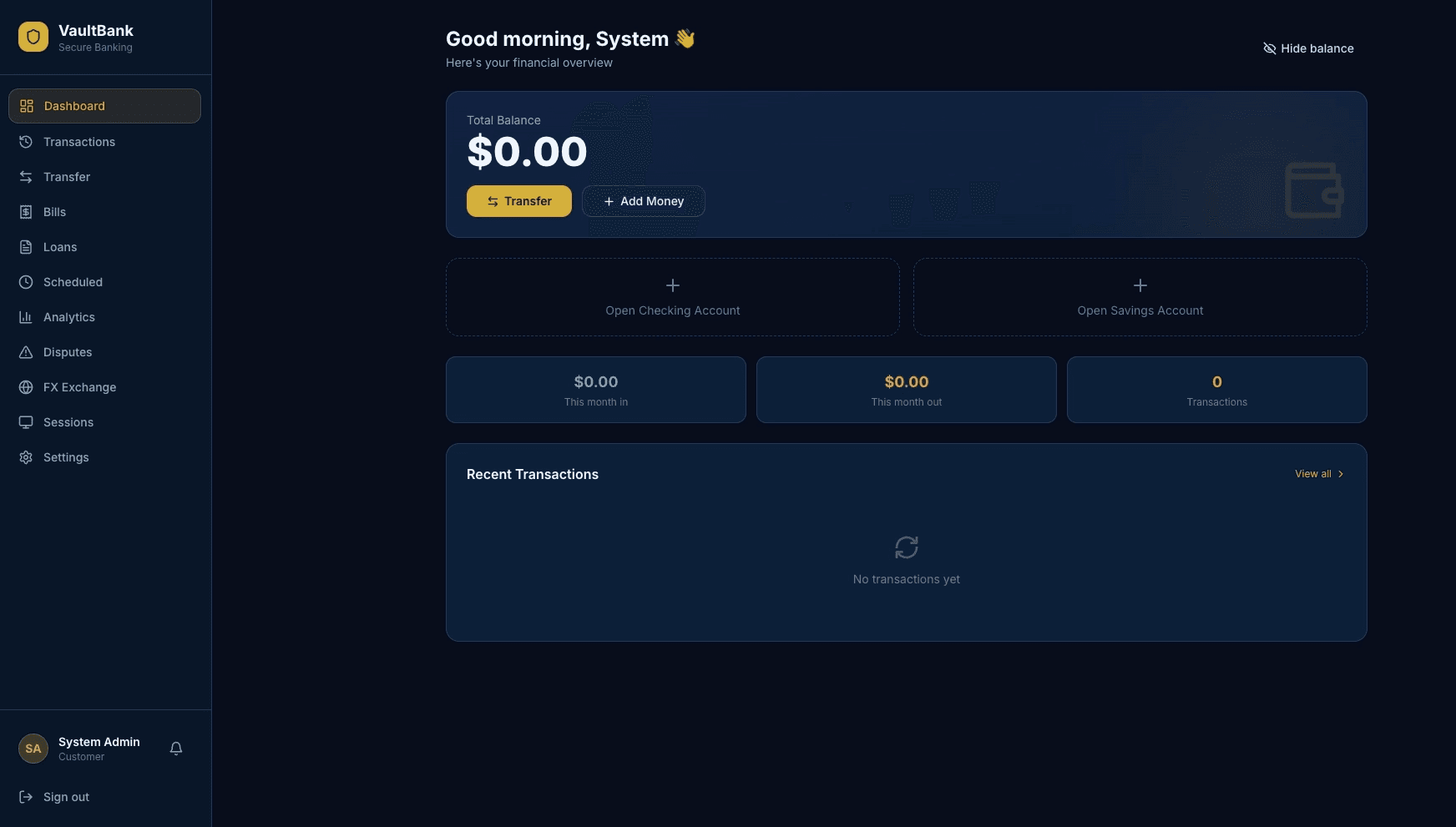 VaultBank is a digital banking platform with accounts, transfers, deposits, loans, disputes, multi-currency support, and two-person approval workflows. The application featured five distinct roles: Customer, Teller, Branch Manager, Compliance Officer, Admin. The domain demands financial integrity; money in must equal money out.