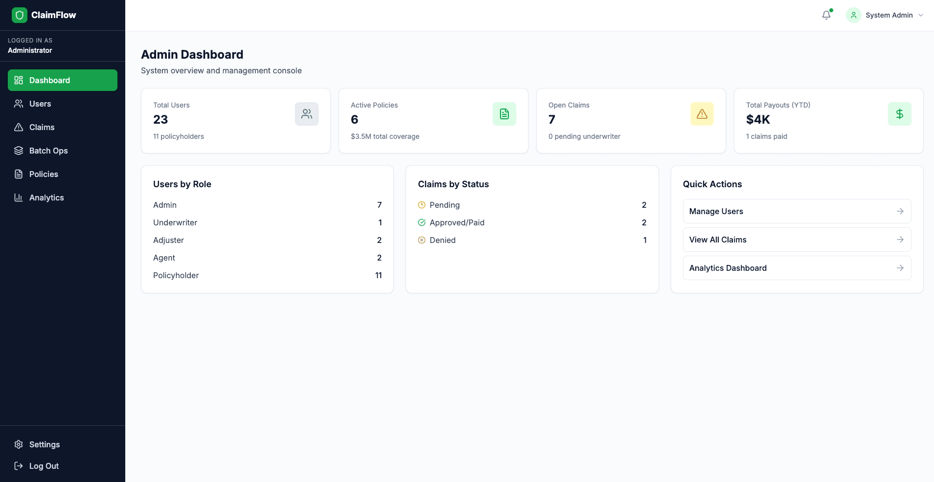 Admins can: manage all users, configure claim workflows, view system analytics, manage policy templates, and handle escalations.