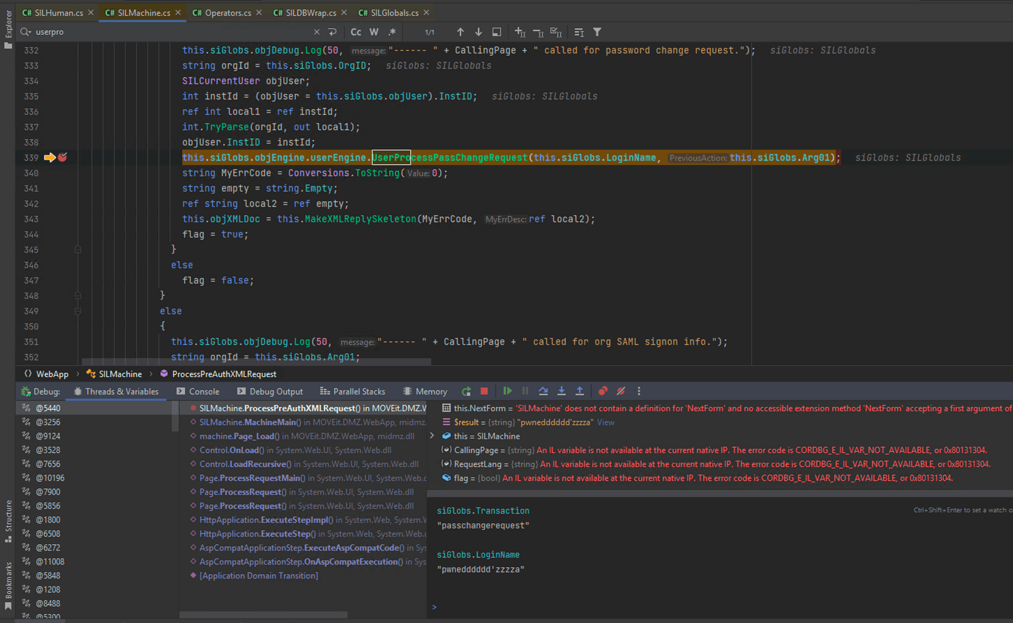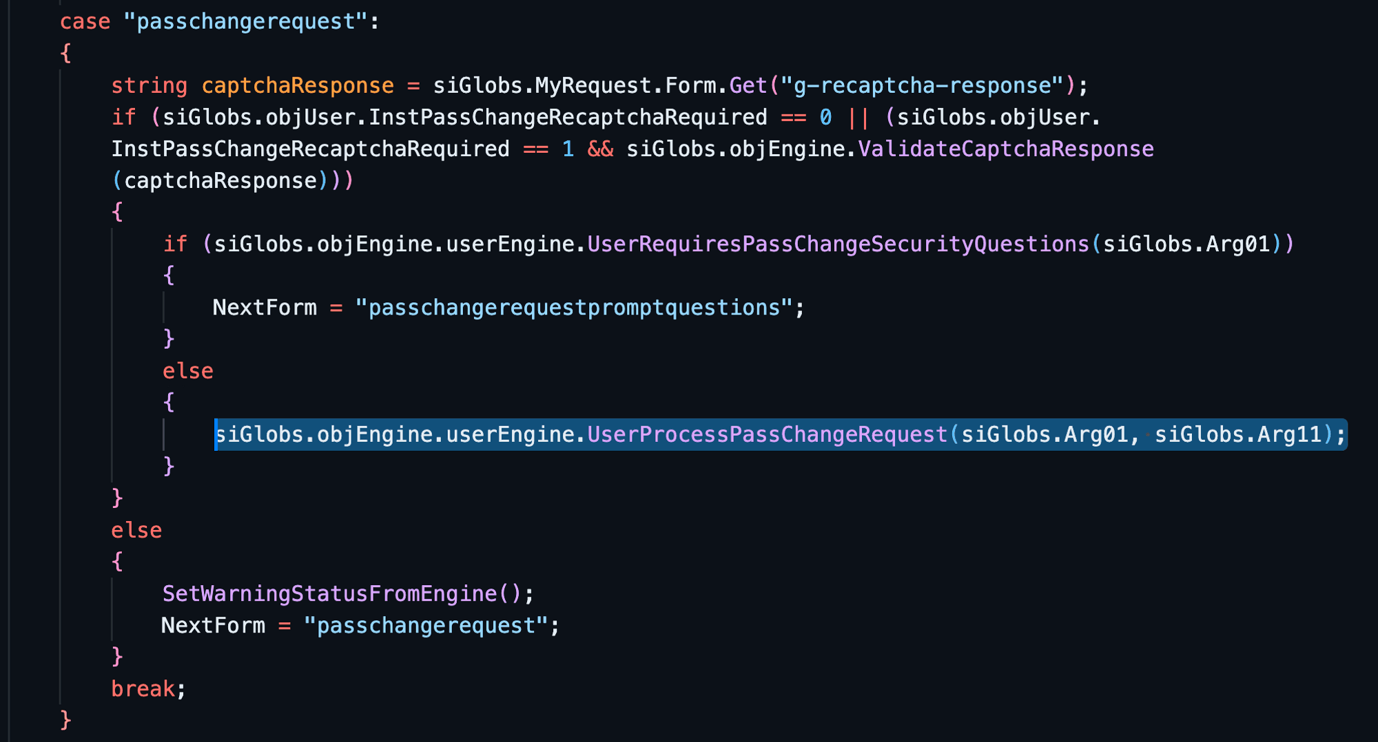 To confirm this, We set up Rider debugger and manually removed the transaction variable from the database for our session and observed that although special characters were now present in Arg01, the function call to UserEngine::UserProcessPassChangeRequest() did not occur. However, when we removed the special characters from Arg01, the function call worked properly. After spending several hours debugging and investigating this approach, we realized that it was a dead end, and we needed to explore alternative methods.