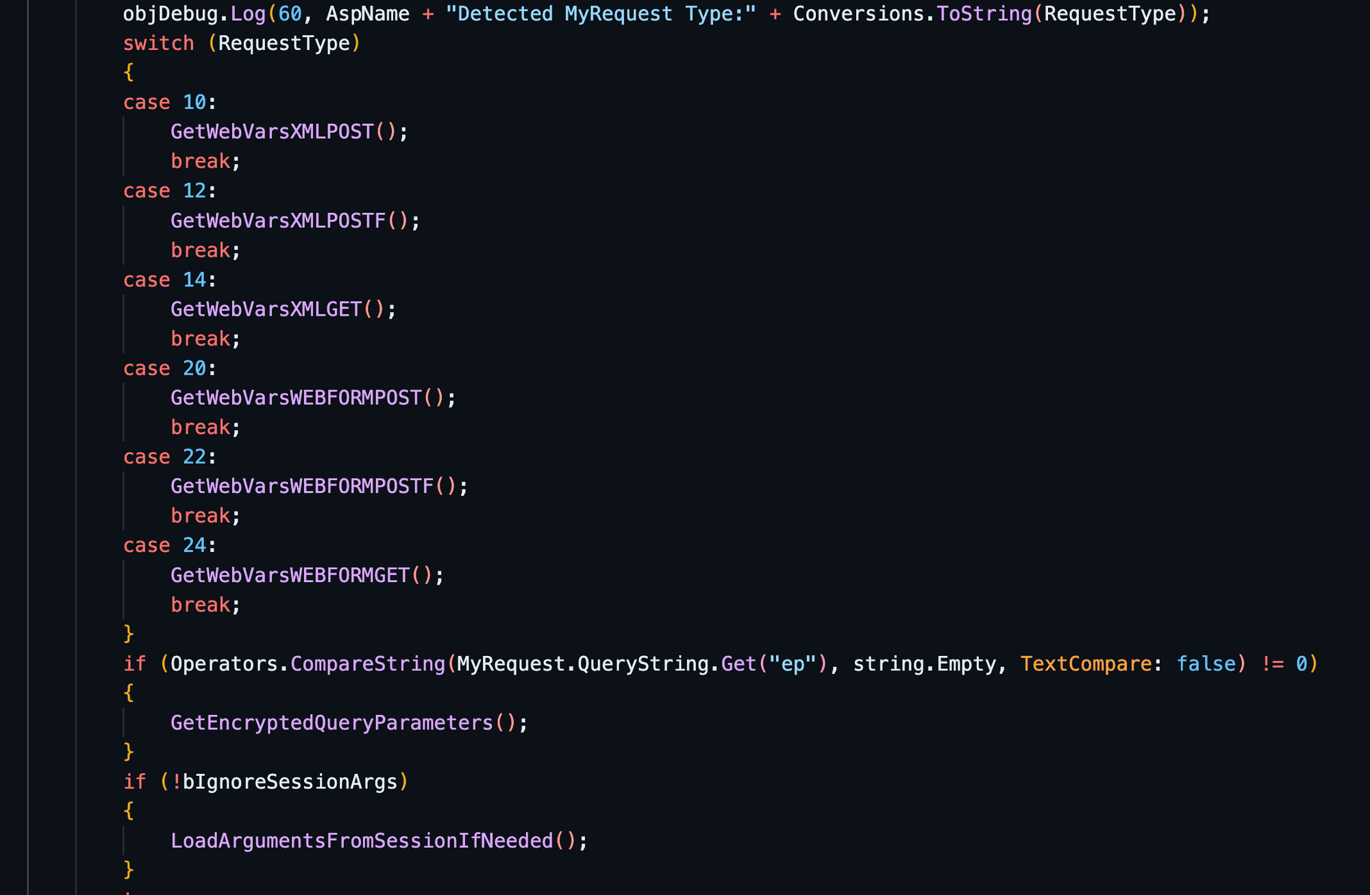 With the debugger set up, we examined each invocation of the SaveArgumentsToSessionForRedirect() function, eliminating options that wouldn't serve our purpose. During this process, one particular call caught our attention, buried deep within a series of if/switch statements. Upon closer inspection in the debugger, we noticed that just above this call, the transaction and LoginName variables were set exactly as we desired. However, we encountered difficulty in reaching this point in the code.
