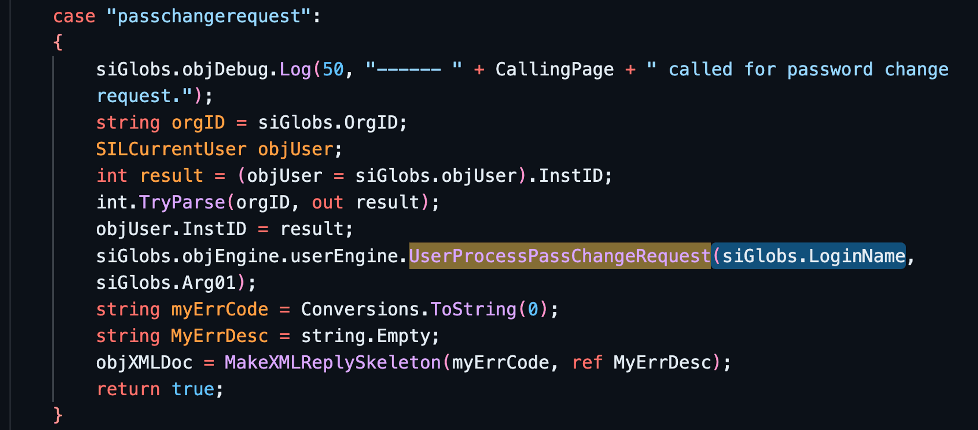 While exploring additional calls to the UserProcessPassChangeRequest function, we came across another invocation of the same function in SILMachine.cs (machine.aspx):