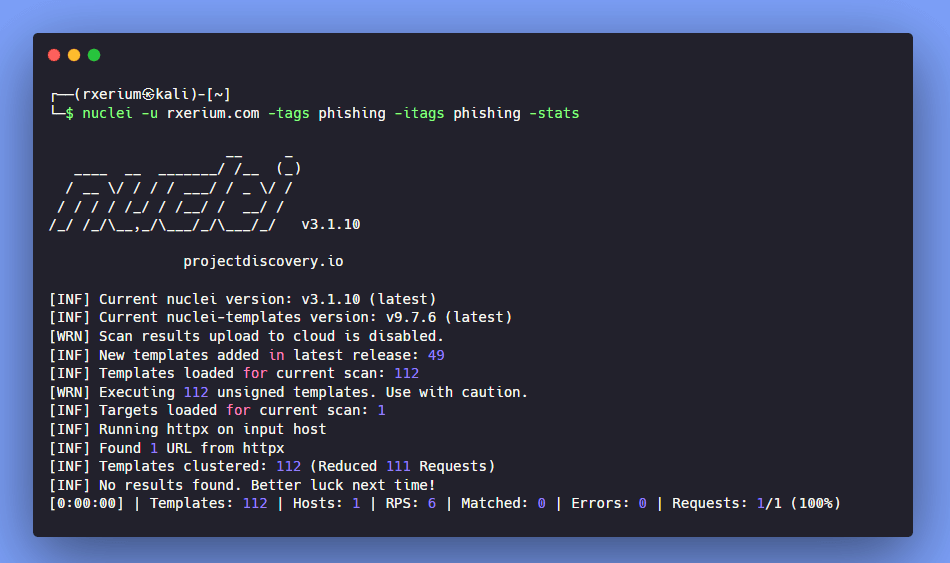 Running all phishing templates through Nuclei is seamless and quick, the below scan took around 2 seconds to complete thanks to the default support for template clustering in Nuclei.