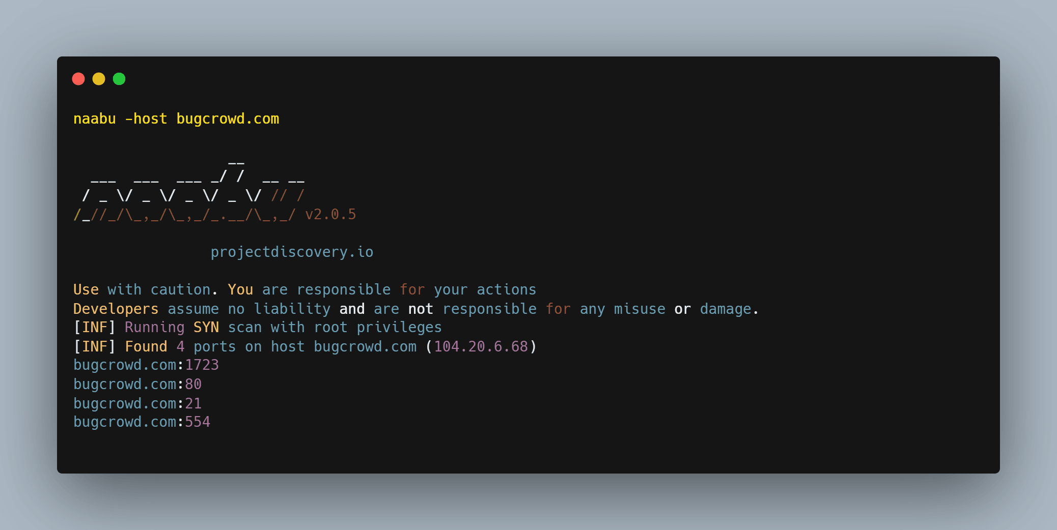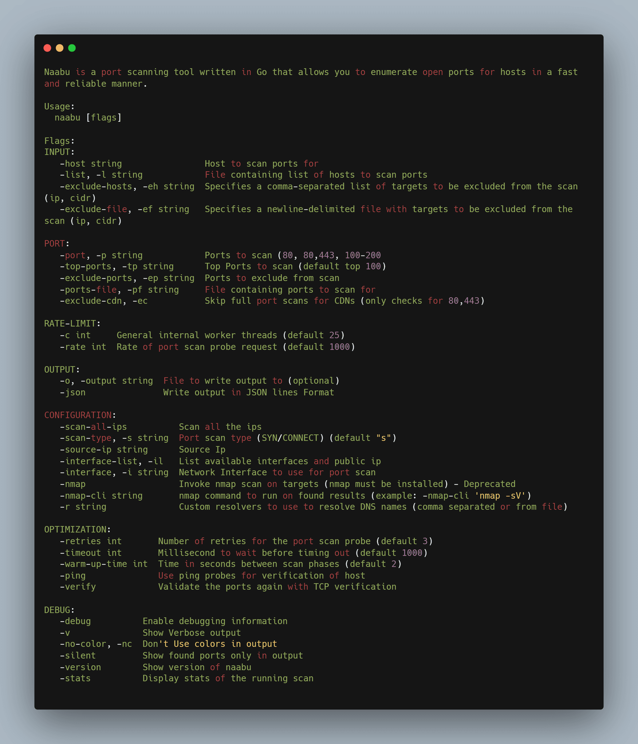 naabu is a tool written in the Go programming language that can quickly and reliably identify open ports on a target system or network. It performs SYN/CONNECT scans on the target system and lists all ports that return a reply, providing information about the services and applications running on the system.