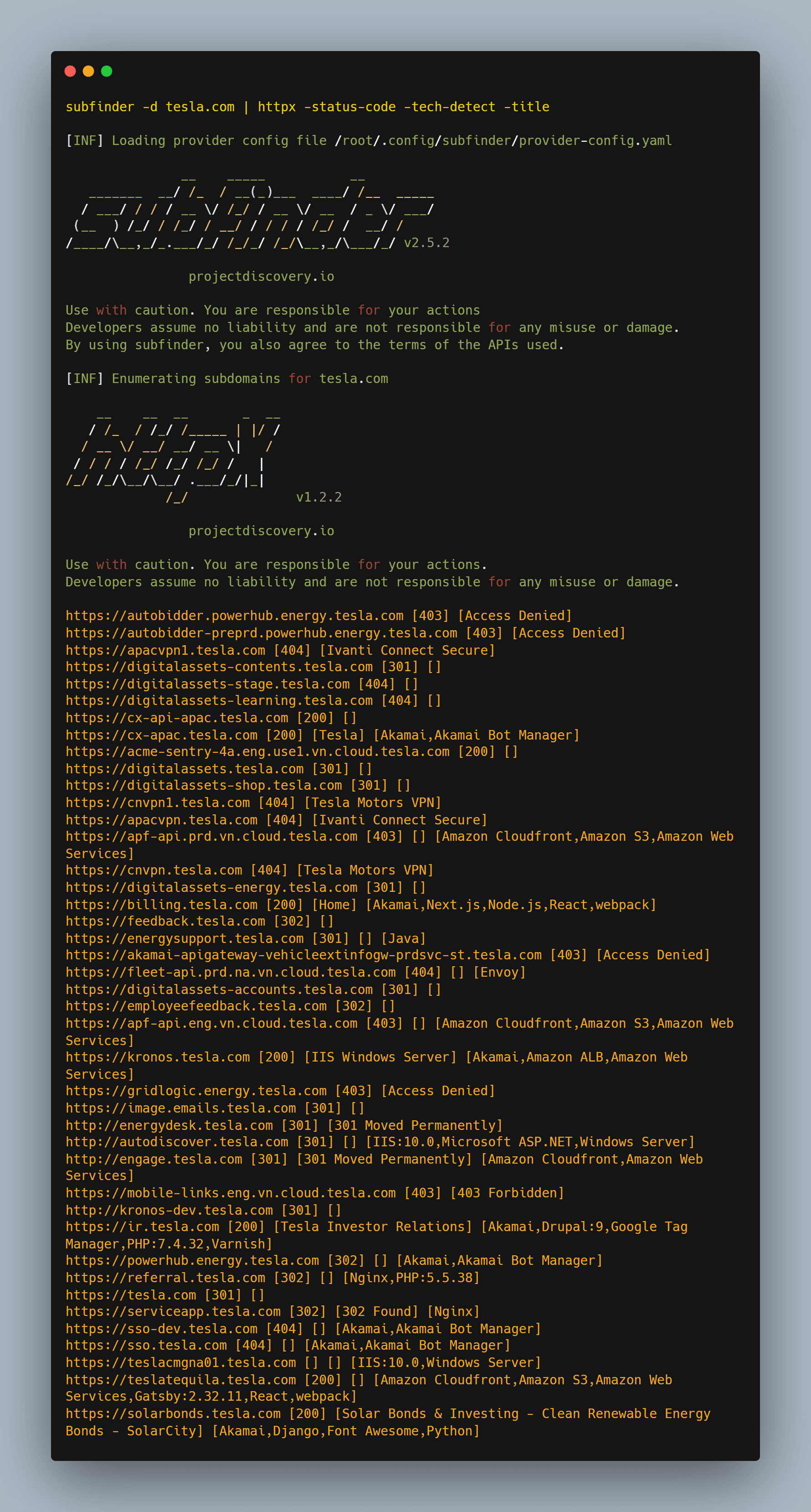 Command: subfinder -d target.com | httpx -status-code -tech-detect -title