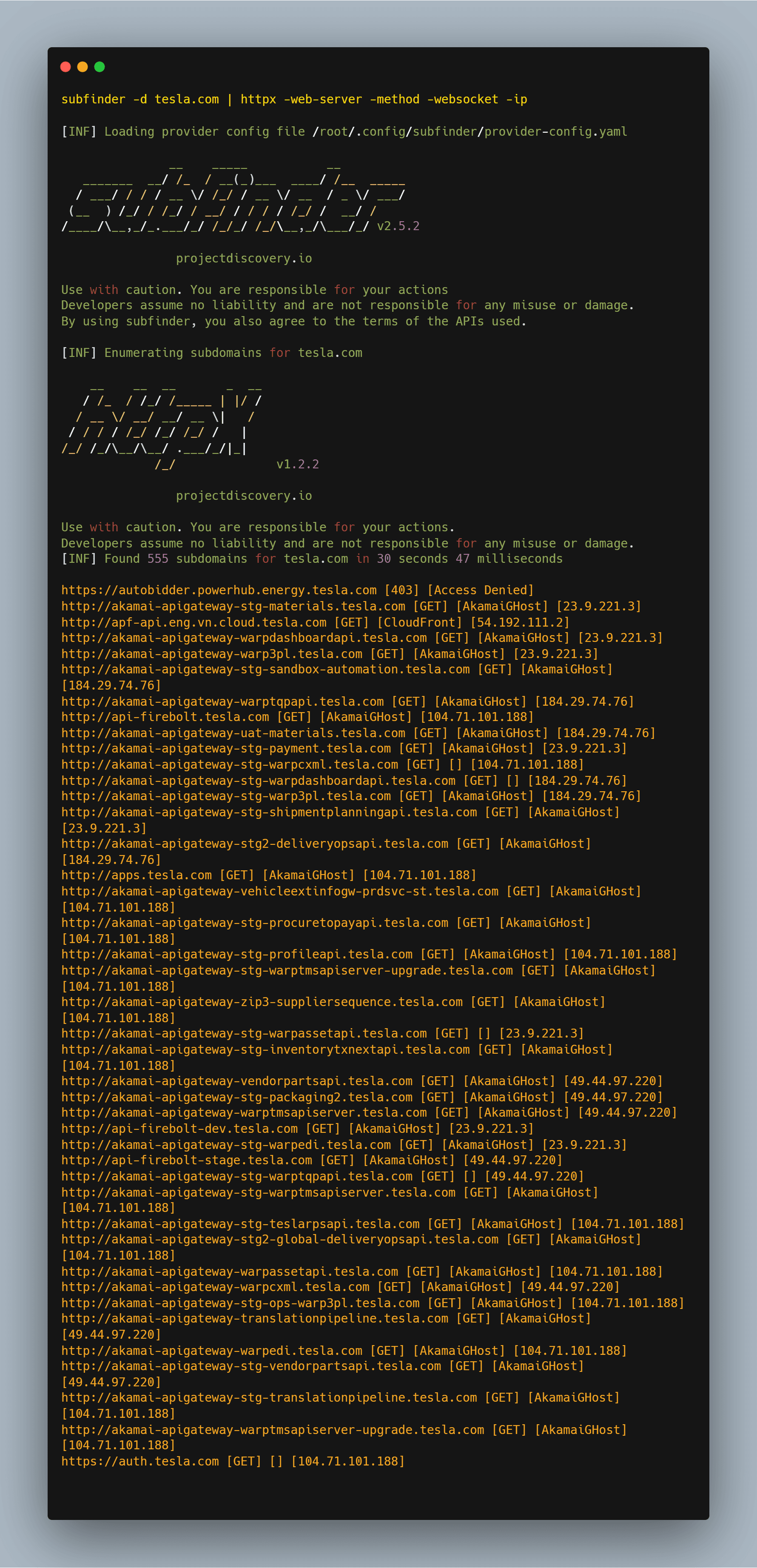 subfinder -d target.com | httpx -web-server -method -websocket -ip