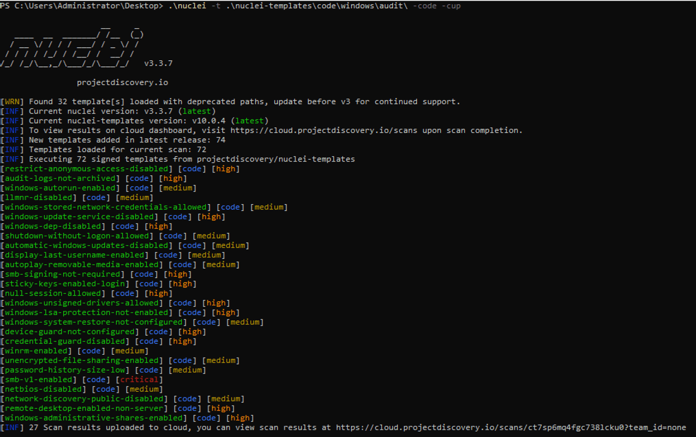 33 - "True"Check out all the other windows audit templates by visiting the Nuclei Templates GitHub repository.