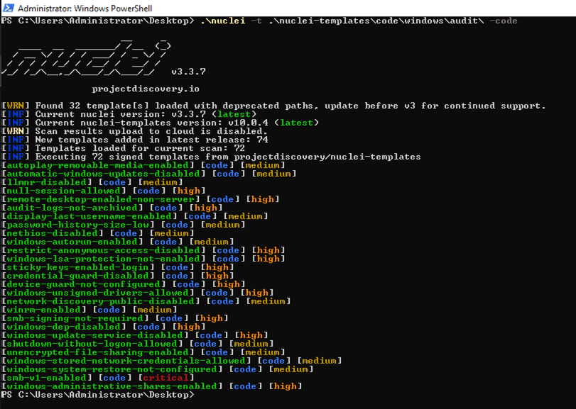 18PS C:\Users\Administrator\Desktop>Now we can execute all the templates using the following command or using the scan profile (`-profile windows-audit`)