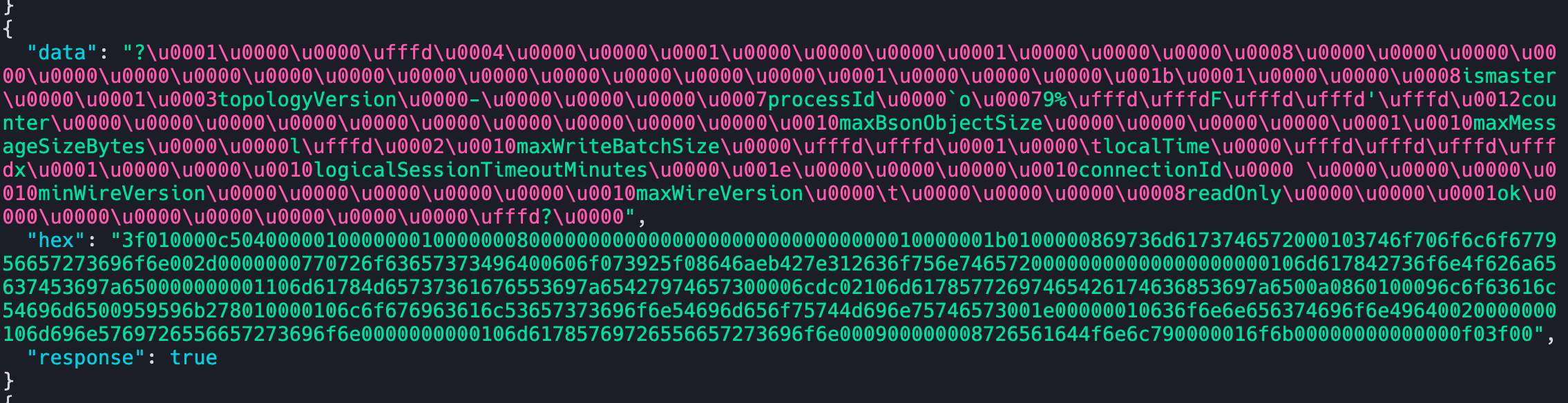 Now here comes the important part. As we can see, the first request is a very interesting one. It tries to identify itself saying mongo-db-driver and also versions etc. It also contains isMaster string that seems related to Mongodb.