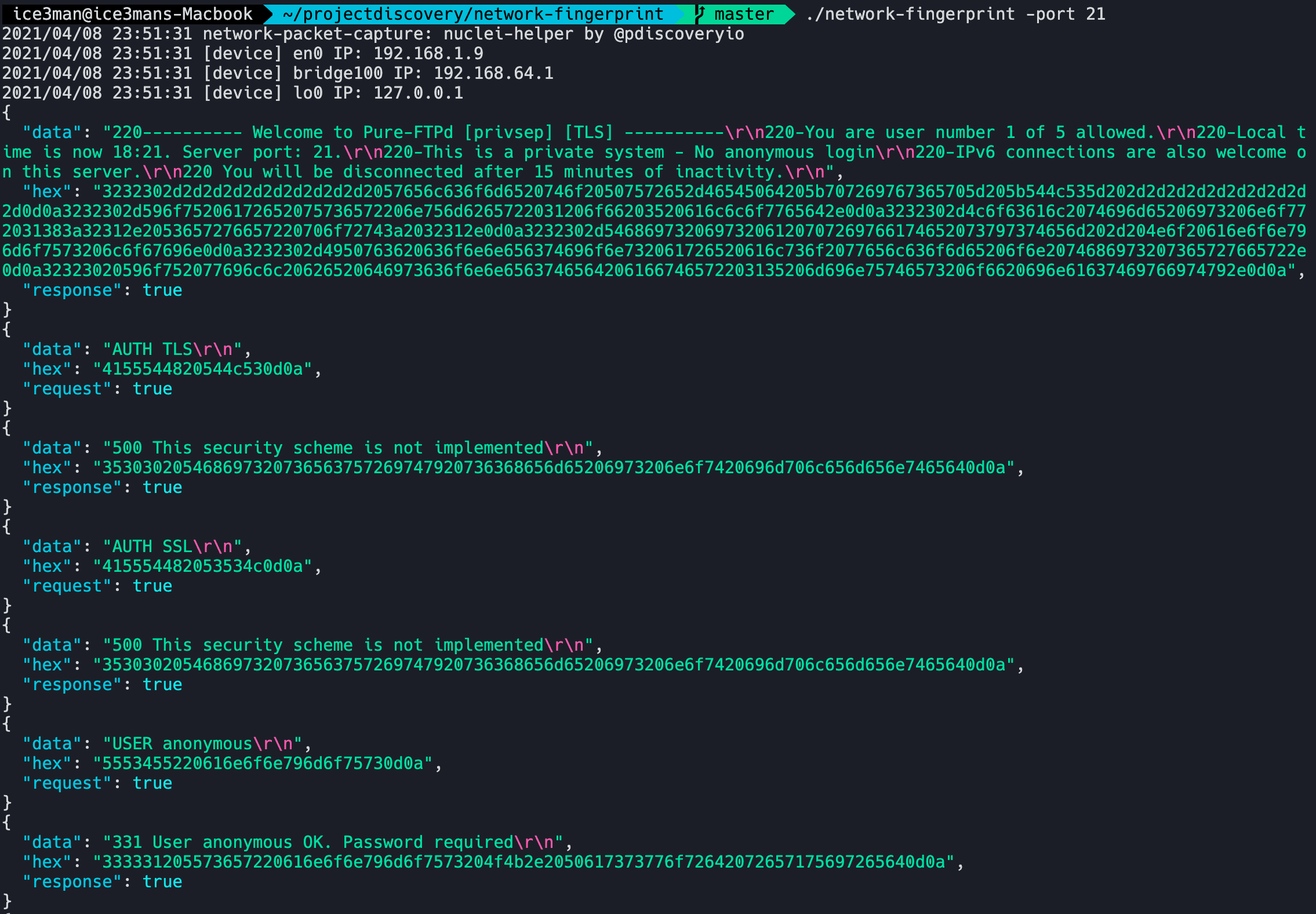 Similar pattern generation can be done for other protocols as well. An example below shows network-fingerprint capturing FTP handshake that can be easily recreated by using nuclei-templates. This was done with a PureFTPd server running in docker and FileZilla OSX client.