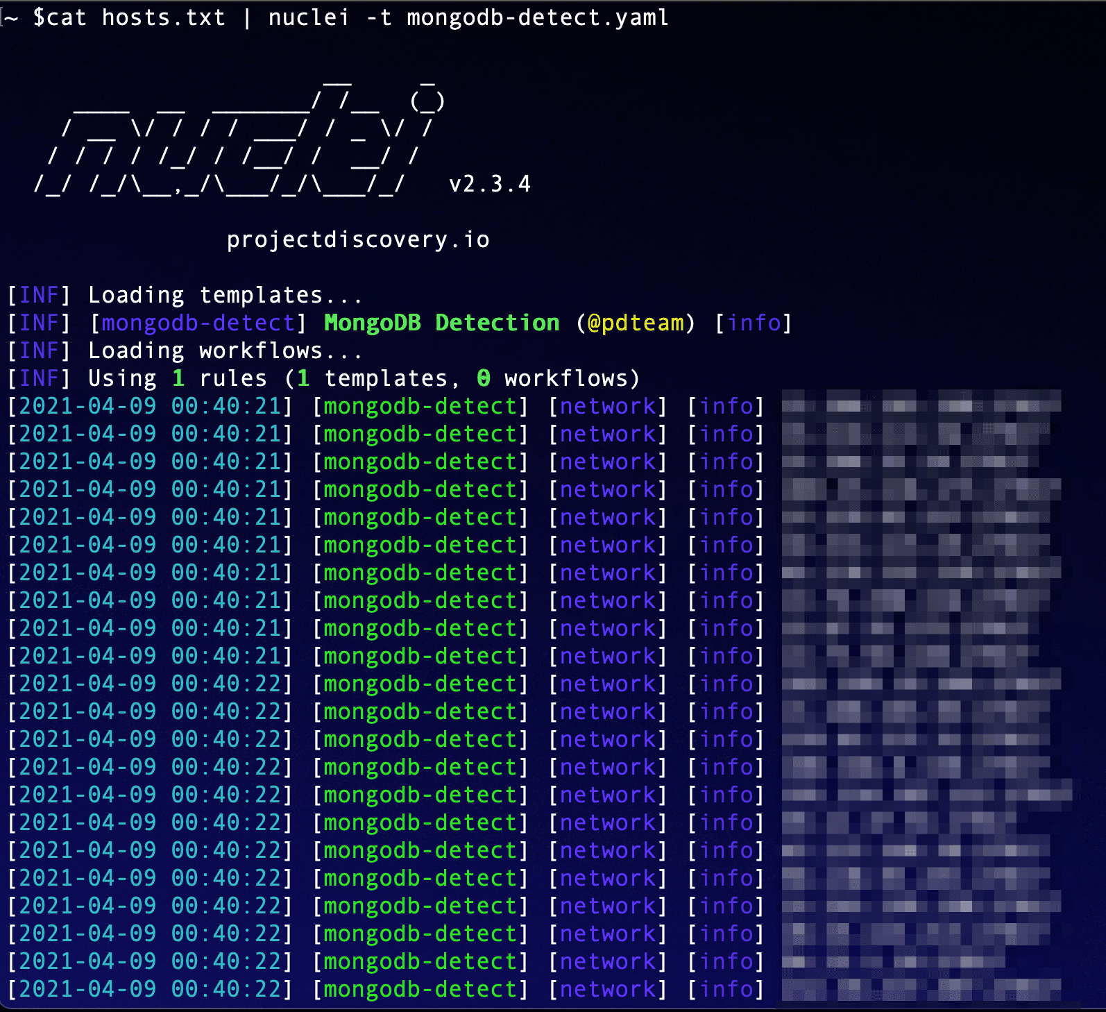 23 - "localTime"The above template is a complete example where we used two words found in the initial response "logicalSessionTimeout" and "localTime" to fingerprint MongoDB servers. We first send the earlier request in hex format, and check these words in the response using matchers.